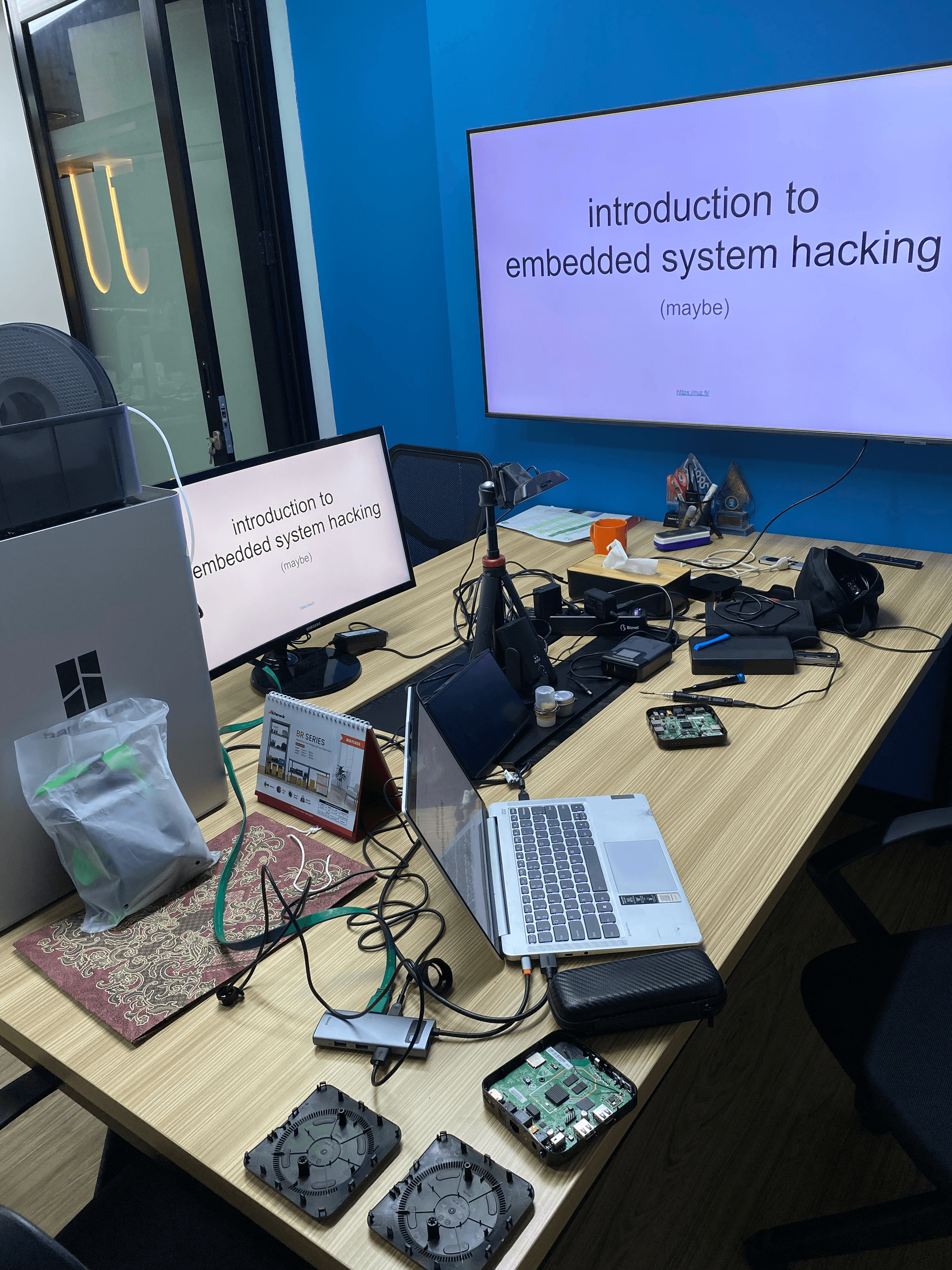 Beberapa bulan di awal tahun 2025 saya mendapat ajakan untuk mengisi sharing session untuk salah satu komunitas IT, cukup bingung karena tidak ada hal yang mampu saya bagikan karena seringkali saya mempelajari sesuatu hanya untuk kesenangan dan pengalaman saja, jadi khawatir yang saya bagikan kurang bisa dimengerti oleh para pendengar. Karena sebelumnya saya pernah membawakan membawakan topik seputar embedded system pada event Indonesia IT Security Conference akhirnya saya coba berbagi pengalaman dengan judul materi introduction to embedded system hacking.